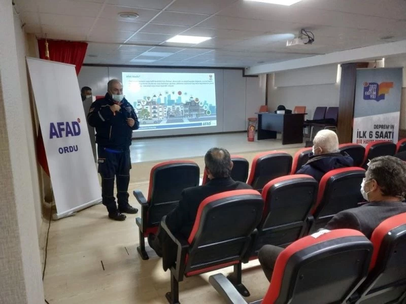 Ordu’da mahalle muhtarlarına ve azalarına afet bilinci eğitimi veriliyor.