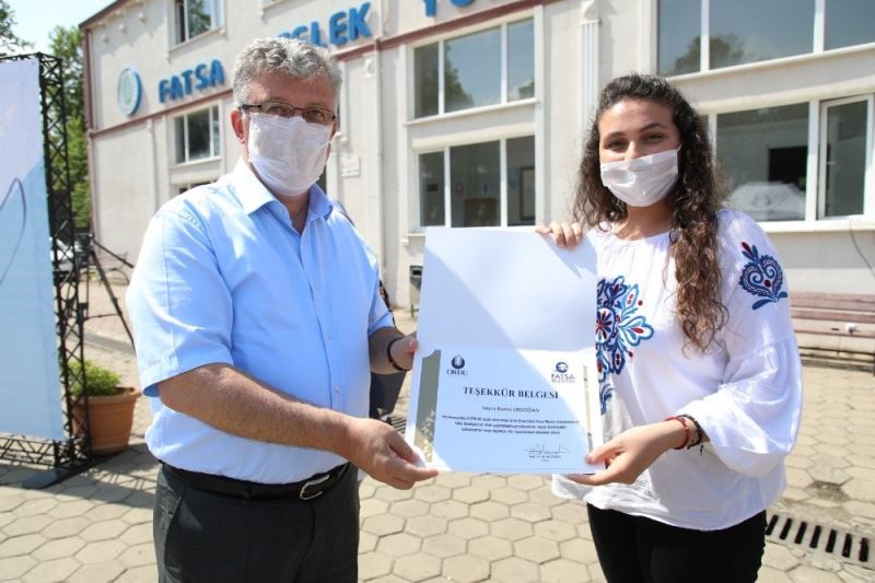 Ordu Üniversitesi (ODÜ) ile Fatsa Belediyesi iş birliği ile gerçekleştirilen ve 2 milyona yakın tıbbi maske üretimin gerçekleştirildiği çalışmaya emeği geçenlere teşekkür plaketi verildi.
