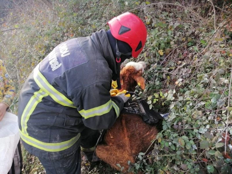Irmakta otladığı sırada balçığa saplanması sonucu mahsur kalan buzağını gören vatandaşlar itfaiye ekiplerine haber verdi. İhbar üzerine harekete geçen itfaiye ekipleri, zorlu bir mücadelenin ardından mutlu sona ulaşarak buzağı olduğu yerden çıkardı.