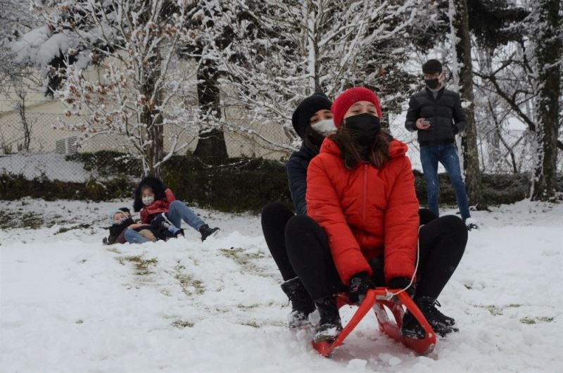 Ordu’nun yüksek kesimlerinde dün akşam saatlerinde etkili olan kar yağışı sonrası kentin şehir terası olan Boztepe’de çocuklar, doyasıya eğlendi.