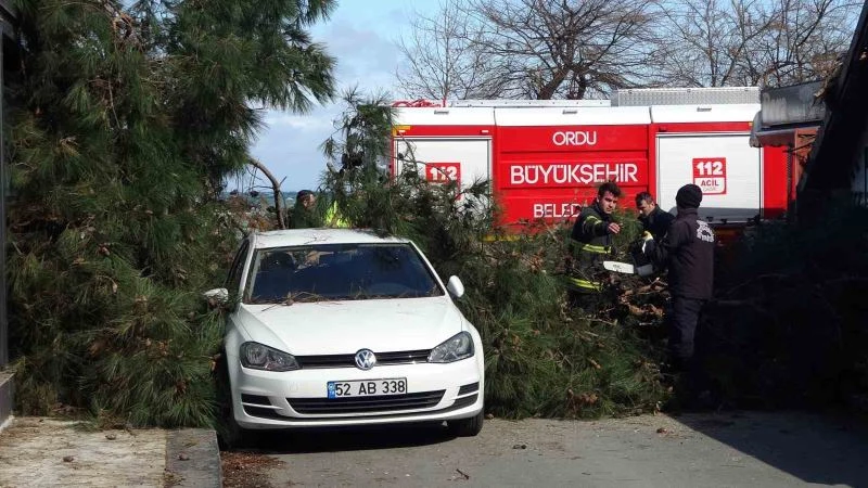Ordu’da fırtına hayatı olumsuz etkilerken, devrilen ağaç otomobile hasar verdi.