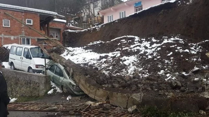 Ordu’nun İkizce ilçesinde bir okulun istinat duvarının çökmesi sonucu iki araçta hasar meydana geldi.