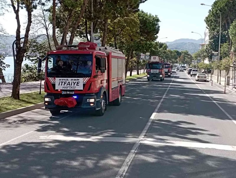 Ordu’nun Ünye ilçesinde itfaiye haftası, itfaiye araçlarının konvoyu ile kutlandı.