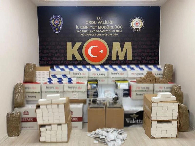 Ordu İl Emniyet Müdürlüğü ekiplerinin tütün ve tütün mamullerine yönelik yapmış olduğu çalışmalar sonucu Altınordu ilçesinde bulunan bir adreste yapmış oldukları aramada yaklaşık piyasa değeri 240 bin TL olan 2 adet sigara dolum makinesi, 473 bin adet bandrolsüz boş makaron, 27 bin 400 adet içi tütün doldurulmuş makaron, 190 kilogram bandrolsüz kıyılmış tütün, 40 bin 500 adet yurt dışı menşei sigara sarma kağıdı ele geçirildi.
