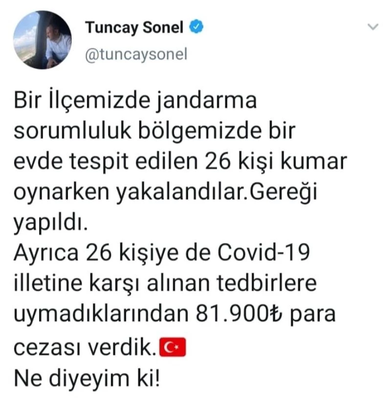 Ordu Valisi Tuncay Sonel, sosyal medya hesabından yaptığı paylaşımla bir ilçede jandarma ekiplerinin 26 kişiyi kumar oynadıkları esnada suçüstü yakaladığına dikkat çekerek, “Gereği yapıldı. Ayrıca 26 kişiye de Kovid-19 illetine karşı alınan tedbirlere uymadıklarından 81 bin 900 TL para cezası verdik” ifadelerine yer verdi.