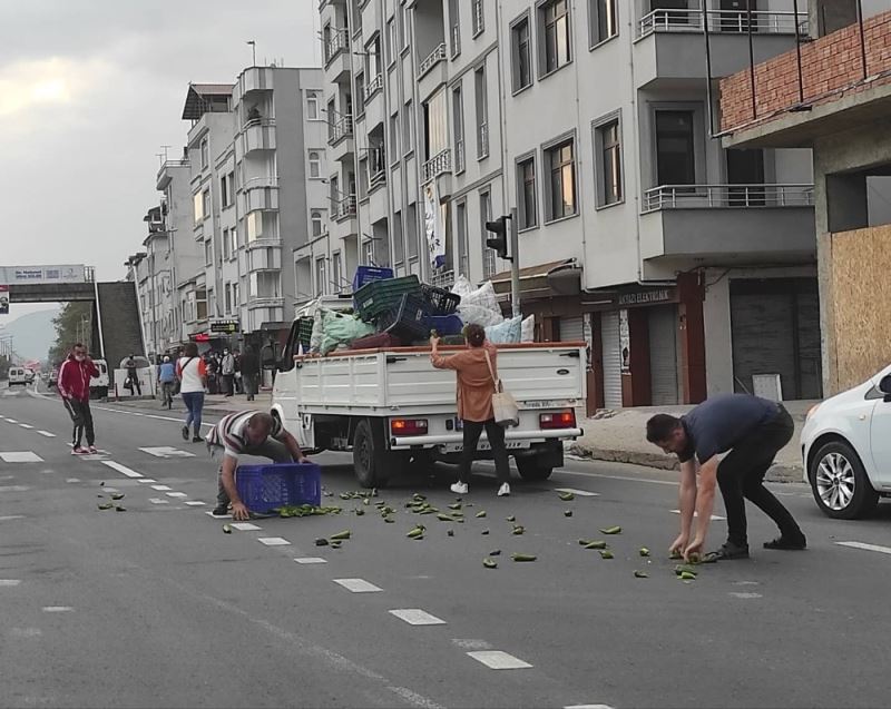 Ordu’nun Altınordu ilçesi Akyazı Mahallesi’nde sebze yüklü kamyonetten yola sebzeler döküldü. Çevrede bulunan esnaf ve vatandaşlar olaya sessiz kalmadı. Kamyonet şoförü ile birlikte yola dökülen sebzeleri el birliği ile geri yüklediler.