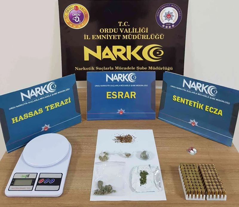 Şüphelilerin ikamet ve iş yerlerinde yapılan aramalarda 5 fişek halinde 5 gram esrar maddesi, 2 adet sentetik ecza uyuşturucu hap, 100 adet tabanca fişeği, 1 adet hassas terazi ele geçirildi.