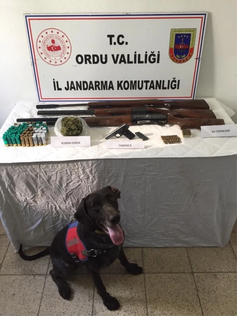 Ordu İl Jandarma Komutanlığı ekiplerince Altınordu ilçesinde adli makamlardan alınan arama kararına istinaden gerçekleştirilen operasyonda 1 şüpheli şahsın ev ve eklentilerinde arama yapıldı. Yapılan aramada 20 gram kubar esrar maddesi, 1 adet ruhsatsız tabanca, 2 adet ruhsatsız av tüfeği, 1 adet faturasız havalı tüfek, 55 adet tabanca fişeği, 62 adet av tüfeği fişeği, 1 adet kasatura ele geçirildi.