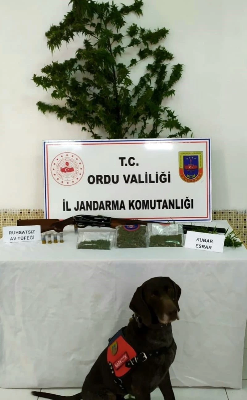 Ordu İl Jandarma Komutanlığı ekipleri, ihbar üzerine ilçeye bağlı Evkaf Mahallesi’ndeki bir adrese operasyon düzenledi. Operasyonda, ev ve eklentilerinde yapılan aramalarda, 83 gram kubar esrar, 7 kök kenevir ile ruhsatsız av tüfeği ele geçirildi.