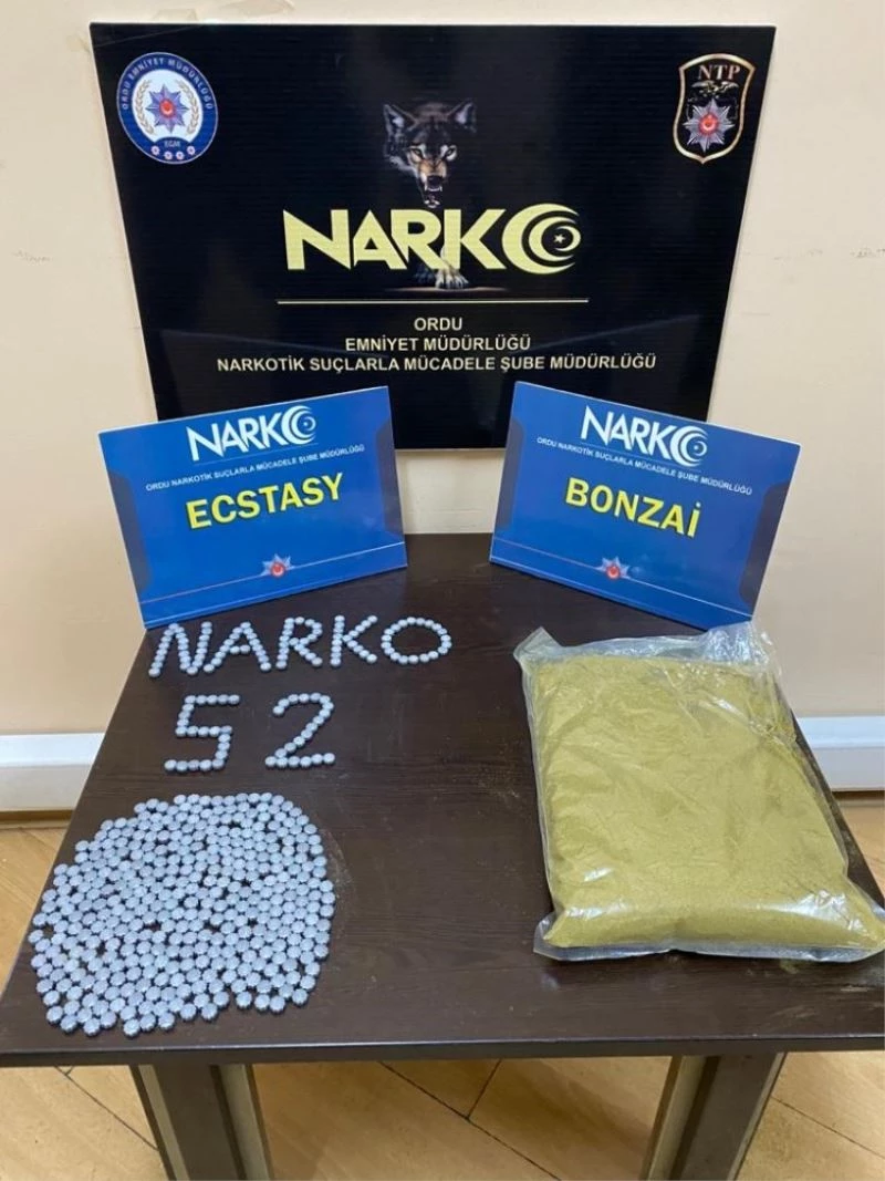 Bir ihbarı değerlendiren Ordu Narkotik Suçlarla Mücadele Şube Müdürlüğü ekipleri şüphe üzerine durdurulan bir araçta bulunan üç şahsın üzerinde ve eşyalarında yapılan aramada 1 kilogram sentetik kannabinoid (bonzai) ve 490 adet ecstasy maddesi ele geçirildi. Olayla gözaltına alınan 3 kişiden 2’si mahkeme tarafından tutuklandı.