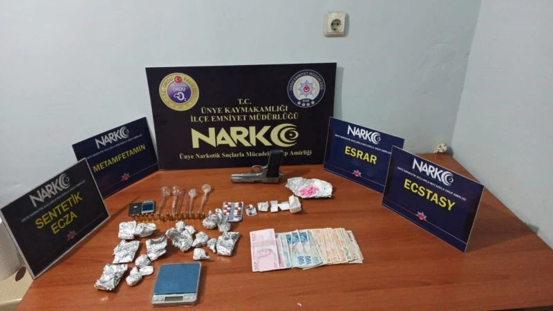 Ünye ilçesinde şüphe üzerine durdurulan bir araçta bulunan 2 şahsın üzerlerinde, eşyalarında ve araçta yapılan aramada toplam 188 gram metamfetamin, 31 adet ecstasy hap, 13 adet sentetik ecza maddesi, 5 gram esrar maddesi ile uyuşturucu madde kullanımına yarayan 4 adet aparat, 1 adet hassas terazi ve 1 adet ruhsatsız tabanca ile 15 adet mermi ele geçirildi. Olayda, uyuşturucu madde ticaretinde elde edildiği değerlendirilen bin 315 TL paraya da el konuldu. Haklarında, uyuşturucu madde ticaretinden dolayı adli işlem yapılan şüpheli şahıslar, sevk edildikleri adli mercilerce tutuklandı.
