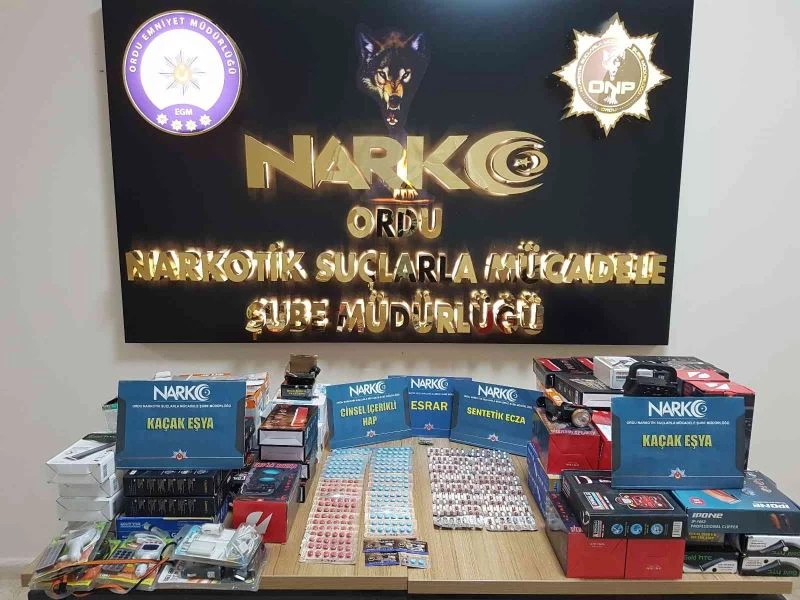 Ordu Emniyet Müdürlüğüne bağlı ekipler tarafından yapılan çalışmalarda Altınordu ilçesinde 2 şüphelinin üzerinde ve eşyalarında yapılan aramada 202 adet uyuşturucu hap, 278 adet kaçak yollarla elde edildiği değerlendirilen cinsel içerikli hap, esrar maddesi, cinsel içerikli jel, 79 adet tıraş makinesi, ampul, ses sistemi, kulaklık ve projektörden oluşan kaçak eşya ele geçirildi.