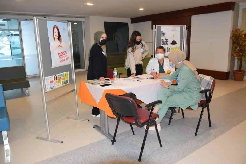 Organ Bağış ve Nakil Koordinatörlükleri tarafından kan alma birimi bekleme alanında kurulan stantta; hasta, hasta yakınları ve sağlık çalışanlarına organ bağışının önemini anlatmak, organ bağış bilincini geliştirmek ve farkındalık oluşturmak amacıyla broşür ve afişlerle bilgilendirme yapıldı. Organ bağışı yapmak isteyen gönüllülerin talepleri standa görev yapan Organ Bağış Biriminde görevli hemşire Esin Er tarafından form doldurularak kabul edildi.