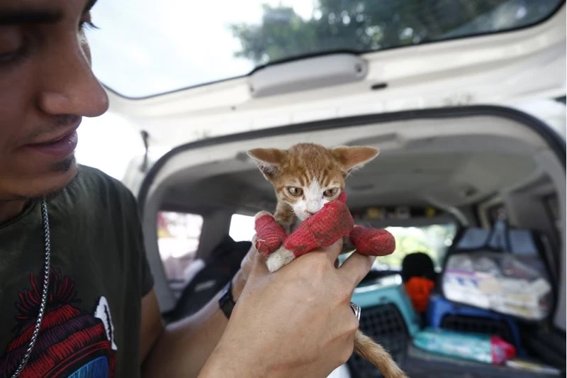 Yangın bölgesinde bulunan yavru bir kedinin bıyıkları ve patilerinin, kaplumbağanın da bir kısmının yandığını belirleyen ekipler, küçük bir kliniğe dönüştürdükleri araçta hayvanlara yardım etti. Ekipler, özenle baktıkları hayvanları su içirip yaralarını sararak hayatta tutmaya çalışıyor.