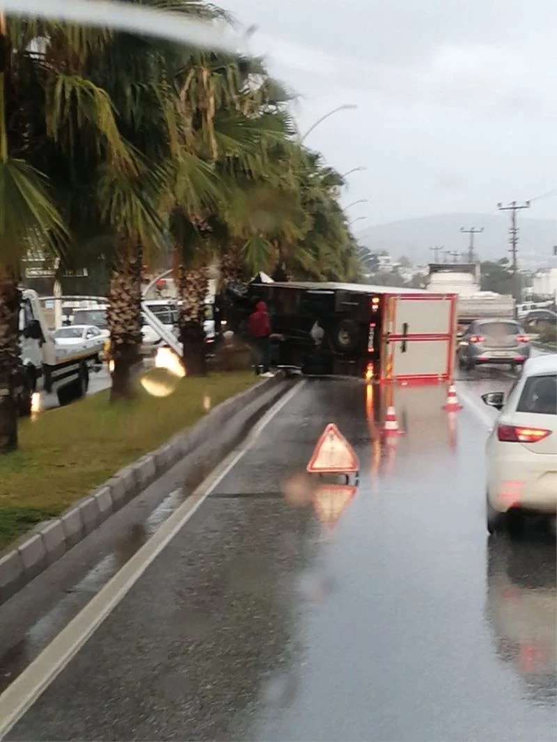 Bodrum’da yağan yağmur sonrası kayganlaşan yolda duramayan kamyonet önce orta refüje çıktı ardından aydınlatma direğini devirdi. Yan yatan kamyonet içerisinden güçlükle çıkarılan sürücü ise yaralandı.