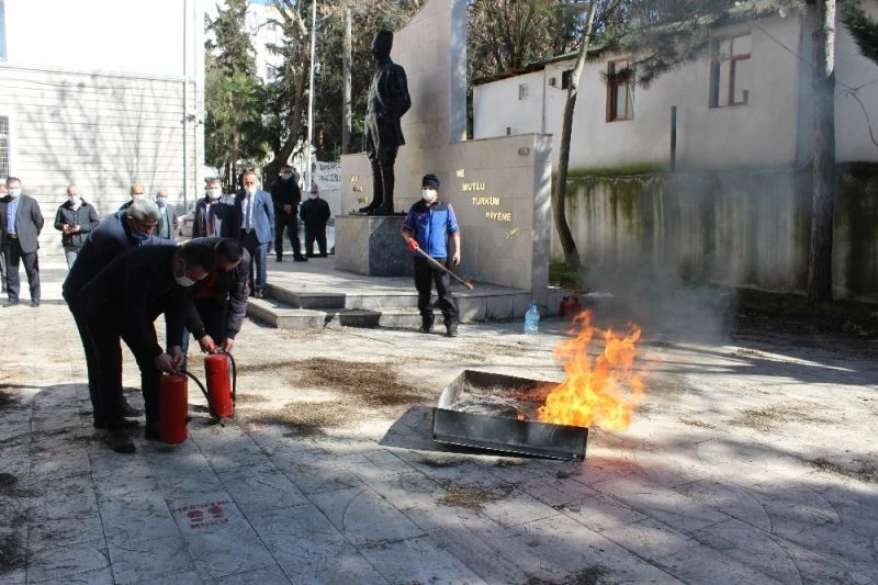 Hükümet konağı önündeki yangın söndürme tatbikatına Kaymakam Yüksel Ünal, kurumlarda görevli çalışanlar katıldı.