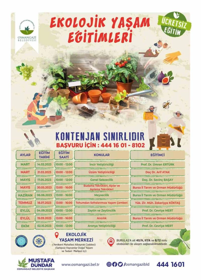 Türkiye’nin en verimli topraklarının yer aldığı Bursa Ovası’nın büyük bölümünü ilçe sınırları içerisinde barındıran Osmangazi Belediyesi, bereketli topraklarında ata tohumu ile üretimi yeniden yaygınlaştırmak, sağlıklı ve zengin yarınlar bırakmak adına birbirinden önemli çalışmalar yürütüyor. Bu çalışmalarını ‘Ekolojik Yaşam Eğitimleri’ ile taçlandırmaya hazırlandıklarını söyleyen Osmangazi Belediye Başkanı Mustafa Dündar, sınırlı kontenjanın olduğu programa herkesi davet etti.