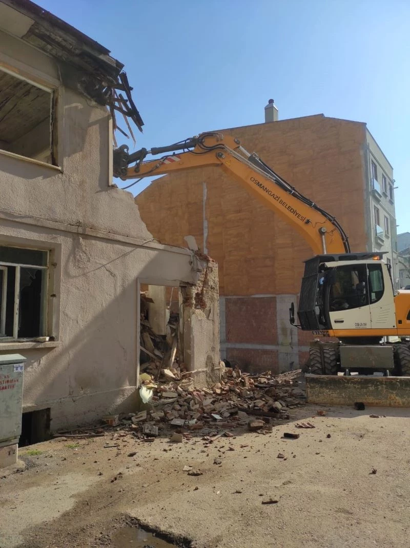 Osmangazi Belediyesi, Hacı İlyas Mahallesi’nde can ve mal güvenliği açısından tehlike arz eden iki katlı metruk binayı yıktı.