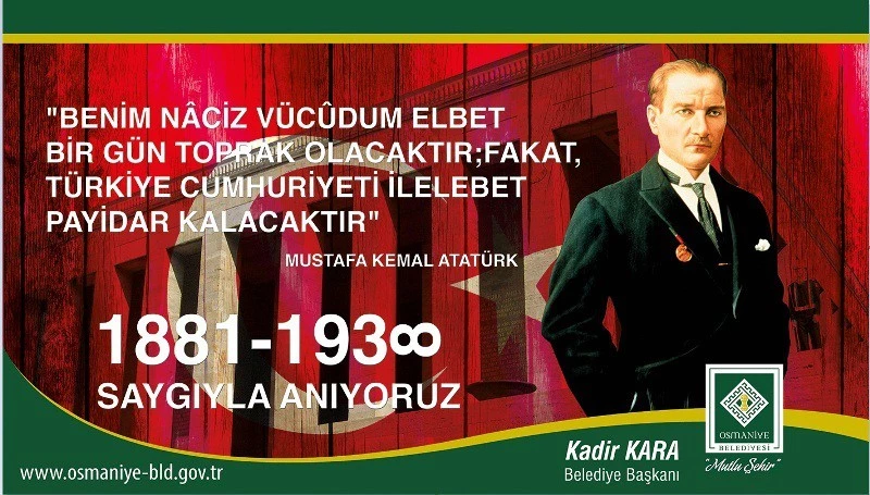 Osmaniye Belediye Başkanı Kadir Kara Türkiye Cumhuriyeti?nin kurucusu Gazi Mustafa Kemal Atatürk?ün vefatının 77.yıldönümü nedeni ile yayınladığı mesajında şunları söyledi.