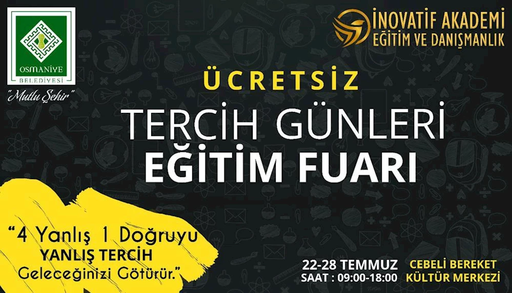 Osmaniye Belediyesi, tercih günleri eğitim fuarı düzenliyor. ?4 Yanlış 1 Doğruyu, Yanlış Tercih Geleceğini Götürür? sloganıyla düzenlenen ücretsiz tercih günleri eğitim fuarı 22 ? 28 Temmuz tarihleri arasında Cebelibereket Kültür Merkezi?nde yapılacak.