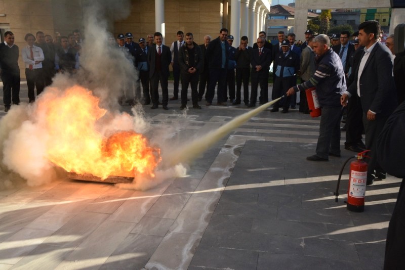 Osmaniye Belediyesi`nin tüm birimlere ayrı ayrı yapılan İş Sağlığı ve Güvenliği eğitimleri kapsamında Belediye Hizmet Binasında yangın tatbikatı yapıldı. Yangın alarmı verildikten sonra kontrollü bir şekilde belediye çalışanları dışarıya çıkarıldı. Bina önünde toplanan personele İş Sağlığı ve Güvenliği Uzmanı Emin Furkan Ersoy, Acil Durum Eylem planı hakkında bilgiler verdi. Acil durumlarda dört tane ekibin olduğunu anlatan Ersoy, bunların yangın söndürme, kurtarma, koruma ve ilk yardım ekipleri olduğunu söyledi. Ersoy, acil eylem planı ekiplerinin ayrı ayrı görevlerini anlattı.İşyeri Hekimi Volkanhan Çapar, ?Yangın tatbikatı kurumumuzda herhangi bir kaza ve yangın esnasında yangına nasıl müdahale edilir, neler yapmamız gerekir veya neler yapmamamız gerektiğini, yangın söndürücü tüplerimizi nasıl kullanacağımız hakkında bilgiler vererek gözden geçireceğiz.? dedi.İş Sağlığı ve Güvenliği Uzmanlarının verdiği bilgiler sonrasında Osmaniye Belediyesi İtfaiye Müdürü Fazlı Şahin, yangında ilk müdahalenin çok önemli olduğunu ifade etti. Eğer yangına ilk iki dakika içinde yangının başlangıç sefasında yangına müdahale edildiğinde mal ve can kayıplarının önlenebileceğini söyleyen Şahin, yangın söndürme tüpleri hakkında da şu bilgileri verdi: ?Bu tüpleri kullanırken rüzgarı arkamıza alarak en az iki metre mesafeden yangına müdahale etmemiz gerekir. Yangın söndürme tüplerinin hiçbir yan etkisi bulunmamaktadır.?Temsili olarak belediye hizmet binasının önünde ateş yakılarak yangın söndürme tüpünü kullanımı uygulamalı olarak anlatıldı. Ateşin söndürülmesi birlikte bilgilendirme tatbikatı başarı ile tamamlandı.