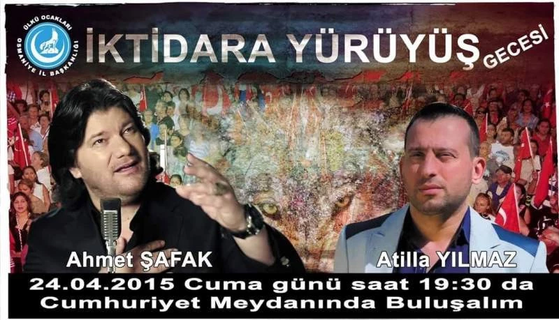 ?Şarkıları, türküleri ve marşları ile gönüllere taht kurmuş iki dev sanatçı Ahmet Şafak ve Atilla Yılmaz Osmaniye Ülkü Ocakları İl Başkanlığı tarafından düzenlenecek olan İktidara Yürüyüş Gecesi?nde sahne alacak.