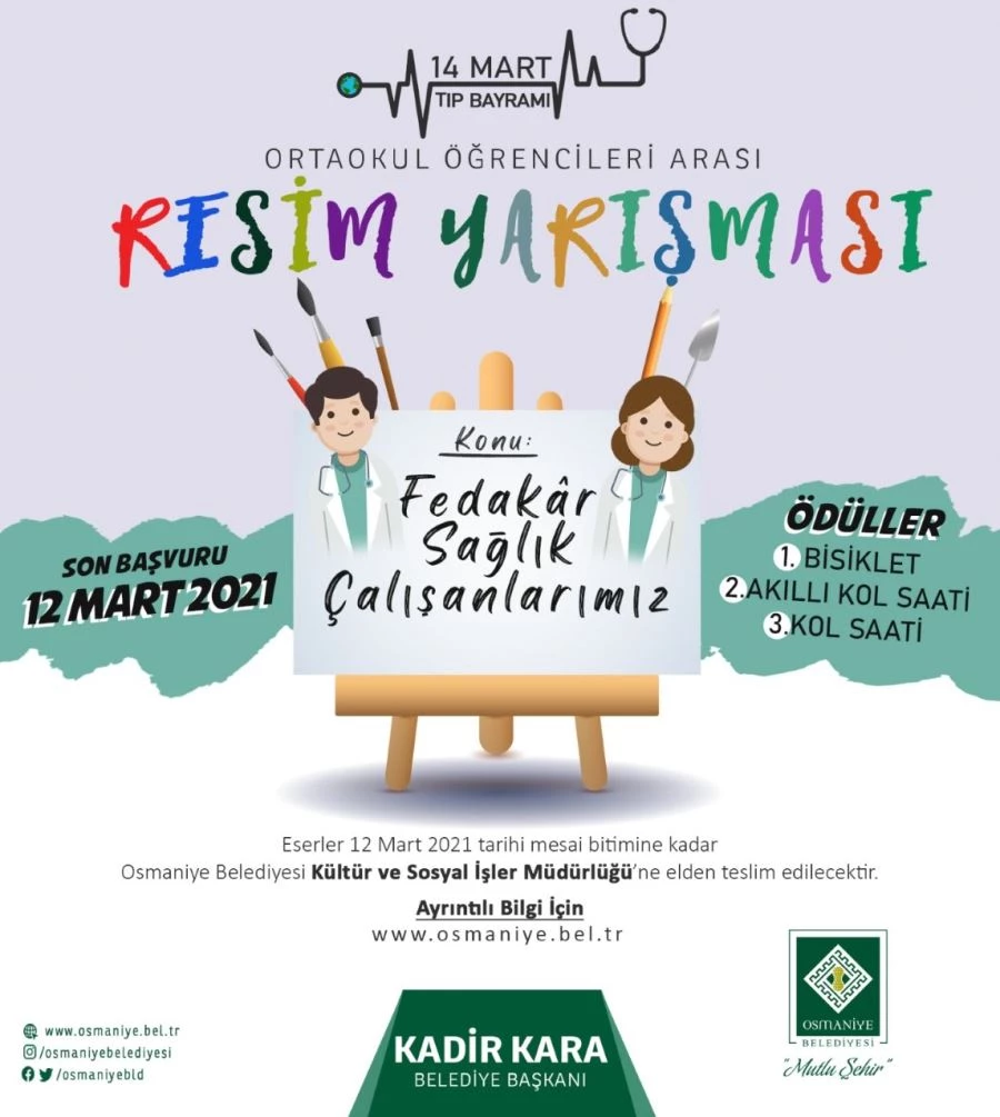 Osmaniye Belediyesi, 14 Mart Tıp Bayramı etkinlikleri kapsamında ‘Fedakâr Sağlık Çalışanları’ konulu resim yapma yarışması düzenliyor.