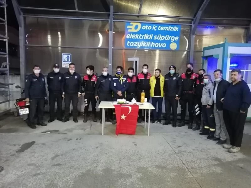 Olay yerine gelen ekipleri konfeti patlatıp alkışlayarak karşılayan istasyon çalışanları, ekiplerin Polis Haftası'nı ve Türk Polis Teşkilatının 176'ncı kuruluş yıl dönümünü kutladı, pasta ve içecek ikram etti.
