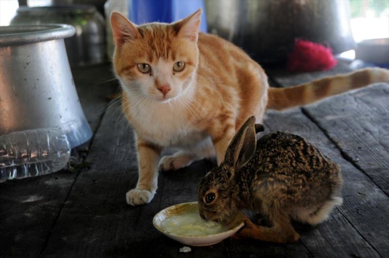 Karaoglu, elleriyle besledigi ve Pamuk adini verdigi tavsani, yeni dogum yapan evin kedisi Sarikiz'in emzirdigini görünce çok sasirdi.