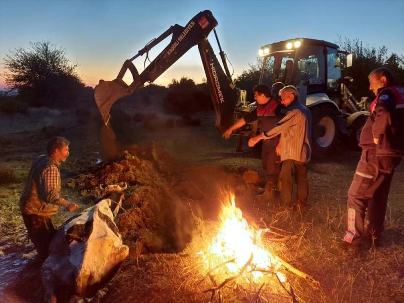 Öte yandan İtfaiye ekipleri ineğin üşümemesi için de ateş yaktı.