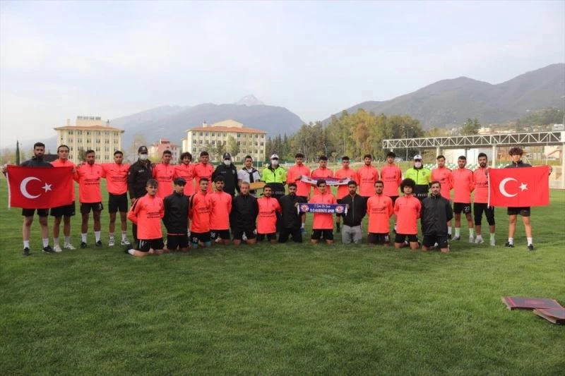 OSMANİYE - Bölgesel Amatör Lig'de mücadele eden futbolcular, stadyumda kavga olduğu yönünde ihbarda bulunmaları üzerine gelen polislerin "Polis Haftası"nı kutladı.