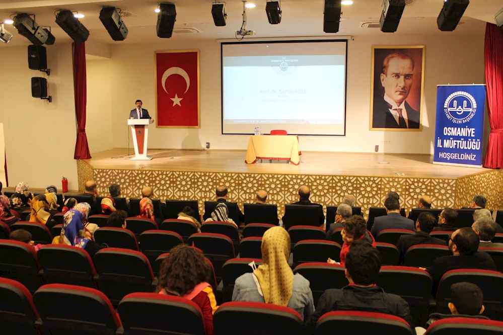 Osmaniye İl Müftülüğü tarafından, `Her ay bir konu bir konuk projesi` kapsamında "İslam da Aile" temalı konferans düzenlendi. Ahmet Şekip Ersoy Kültür Merkezinde ki programa, İzmir Kâtip Çelebi Üniversitesi Rektörü Prof. Dr. Saffet Köze konuşmacı olarak katıldı. Program, Merkez Fetih Camii İmam - Hatibi Mahmut Durmuş?un Kur?an-ı Kerim Tilavetinin ardından İl Müftüsü Ali Rıza Tahiroğlu açılış konuşması ile devam etti.