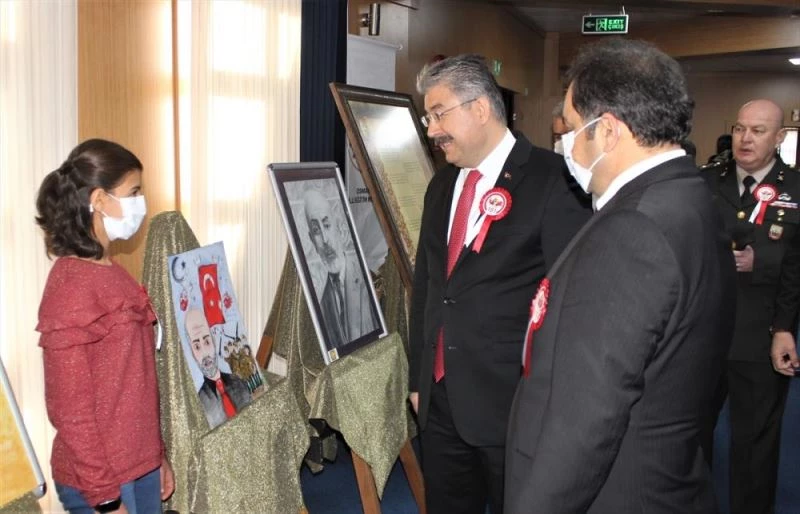 İl Milli Eğitim Müdürlüğü Kültür, Sanat ve Kongre Merkezi'nde düzenlenen program öncesi Vali Erdinç Yılmaz ve protokol üyeleri, Mehmet Akif Ersoy ve İstiklal Marşı'nı anlatan fotoğraf ve resimlerin yer aldığı sergiyi gezdi.