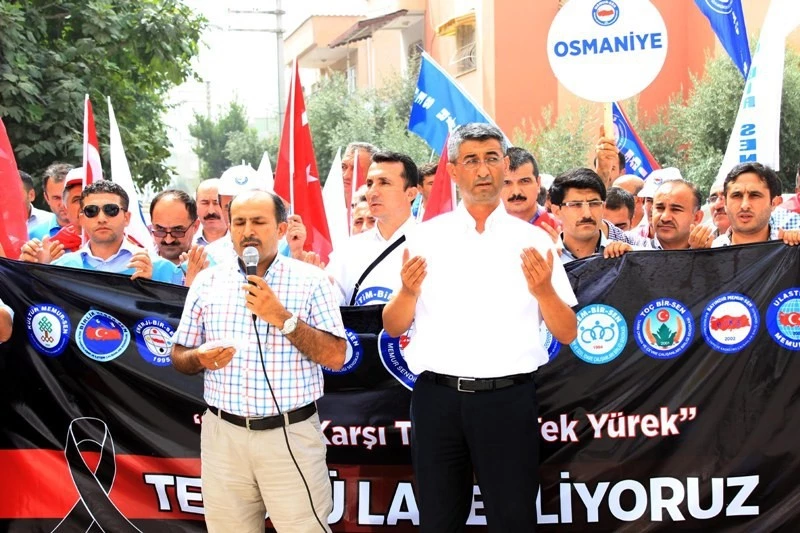 Osmaniye`de Memur-Sen İl Temsilciliği, son zamanlarda artan terör olaylarına, düzenledikleri basın toplantısıyla tepki gösterdi. Mehmet Akif Ersoy Mahallesi Atatürk Caddesi üzerinde bulunan Eğitim Bir-Sen binası girişinde toplanan yaklaşık 100 kişilik guruba, Ak Parti Osmaniye Kadın Kolları Başkanı Meryem İci ve bazı üyeleri de katılarak destek oldu. "Teröre karşı tek ses, tek yürek. Terörü Lanetliyoruz" yazılı pankartında açıldığı basın açıklaması sonunda, şehitler için dua yapıldı. Gurup adına basın açıklaması yapan Memur Sen İl Temsilcisi ve Eğitim Bir Sen Osmaniye Şube Başkanı Mahmut Kahraman, "Gün hep birlikte en büyük temel hak olan yaşama hakkına sahip çıkma günüdür" dedi.  Başta Dağlıca olmak üzere Türkiye`nin çeşitli şehirlerinde yaşanan ve Türk Milletini derinden sarsan eli kanlı terör örgütünün saldırılarını şiddetle kınadıklarını ve lanetlediklerini belirten Kahraman, "Şehitlerimize Allah?tan rahmet, kederli ailelerine ve milletimize baş sağlığı, yaralılarımıza acil şifalar diliyoruz. Terör, kan ve şiddetten beslenen bir insanlık suçudur. Bu insanlık suçunu ancak aklı, ruhu ve vicdanı iflas etmiş kişiler ve gruplar işleyebilir. Terörizmin ve teröristlerin hedefi ise insanlıktır, kardeşliğimizdir, milletimizdir, ortak geleceğimizdir, birlikte yaşama irademizdir. Ülkemize, milletimize ve geleceğimize yönelen bu canice saldırılar, ister PKK ister IŞİD isterse DHKP-C?den gelsin; terörü, teröre destek verenleri, terörün arkasındaki iç ve dış güçleri nefretle kınıyoruz. Bu alçak terör örgütlerine karşı bugüne kadar olduğu gibi bundan sonra da birlikte mücadele vermeye devam edeceğimizin bilinmesini istiyoruz. 7 Haziran 2015 Milletvekili Genel Seçimleri sonrasında oluşan siyasi belirsizliği, kirli emelleri ve alçakça planları için kullanan terör örgütleri, masum insanları hedef seçmiş ve katliamlara başlamıştır. 20 Temmuz 2015 Günü Suruç`ta 32 gencimizin karanlık eller tarafından haince öldürülmesinin ardından PKK terör örgütünün asker ve polislerimize art arda yaptığı saldırılarla Türkiye yeniden terör sarmalının içine çekilmiştir. Analar ağlamasın, ocaklar sönmesin ve kardeşlik hukuku gelişsin mottosuyla başlatılan milli, kardeşlik sürecinde yeni katliamlar yapmak, kan ve gözyaşı siyasetini devam ettirmek için planlar yapan PKK terör örgütü, haince saldırılarıyla milletimizin birliğine ve dirliğine tuzak kurmuş, toplumun birlikte yaşama umuduna kurşun sıkmıştır. İçerden ve dışarıdan beslenen terör örgütlerinin adları, haince planları ve amaçları ne olursa olsun, 78 milyonun hep birlikte geleceğe yürüyüşünü, Yeniden Büyük Türkiye?yi inşa yolculuğunu engelleyemeyecekler, gelecek umutlarımızı söndüremeyeceklerdir. Gün, büyük Türkiye?nin önünü kesmek, milletimizin moralini bozmak, kardeşlik hukukunu bitirmek için saldırılar yapan terör örgütlerine, terör örgütlerine silah dahil lojistik destek veren yabancı güçlere, eli kanlı terör örgütlerinin reklamını yapan medya ve sivil toplum kuruluşlarına karşı birlik olma, ortak hareket etme ve kararlı mücadele verme günüdür. Gün, ?Bir insanın ölümü bütün insanlığın ölümüdür? anlayışına sahip olanların, teröre karşı topyekun el ele, omuz omuza olma günüdür. Gün, şehitlerimizi, gazilerimizi, ailelerini ve tüm terör mağdurlarını yalnız bırakmama günüdür. Gün, dünyada ve bölgemizde itibarı yükselen, bu yolda emin adımlarla ilerleyen güçlü ve lider Türkiye?ye destek verme günüdür. Çare nedir? Çare, teröre karşı tekvucut olmaktır. Özgürlük-güvenlik dengesini gözeterek şiddetle ve terörle mücadele etmektir. Çare, terör örgütlerinin oyununa gelmeden demokratikleşme çalışmalarını sürdürmektir. Çare, sıkıyönetim ve olağanüstü hal tuzağına düşmeden terörle etkin mücadeleyi yürütmektir. Çare, etnik fitneye karşı kardeşlik hukukunu zirveye taşımaktır. Çare, mezhep fitnesini de devreye sokmak isteyenlere karşı din kardeşliğini, inanç birlikteliğini kuvvetlendirmektir. Çare, insanlık suçu işleyen terör örgütlerine karşı tüm insanlığı ortak mücadelede buluşturmaktır. Çare, toplumda çaresizlik sendromu oluşturmak isteyenlere karşı umutları büyütmektir. Çare, teröre karşı tüm sivil toplum kuruluşları olarak birlikte hareket etmektir. Çare, halk öncüleri kanaat önderlerini devreye sokmaktır. Çare, bin yıllık desende, 1400 yıllık İslam kardeşliğinde buluşmaktır. Çare, Türkiye?yi büyütmektir. Çare, siyasi, toplumsal ve ekonomik istikrarı güçlendirmektir. Çare Yeniden Büyük Türkiye ve Yeni Dünya idealini canlı tutmak ve bu yolda var gücümüzle çalışmaktır. Terörü hep birlikte yenebiliriz. El ele vererek terörü tarihin çöp sepetine atabiliriz. Bunun için özgürlük-güvenlik dengesini gözeterek terörle mücadeleyi amansız bir şekilde sürdürürken, eşit vatandaşlık zemininde demokratik, sivil ve özgürlükçü bir anayasayı mutlaka hayata geçirmeliyiz. Her türlü provokasyona ve engellemeye rağmen başta Doğu ve Güneydoğu olmak üzere Türkiye?nin yedi bölgesinde yatırımlar artırılmalıdır. Sivil toplum kuruluşları başta olmak üzere Türkiye?nin yumuşak güç unsurlarından bölgesel barışın ve dünya barışının oluşturulmasında etkin bir şekilde yararlanılmalıdır. Eğitim sistemimiz değerler odaklı olarak yeniden yapılandırılmalı, gençlerimiz milli, manevi ve ahlaki değerlerle donatılmalıdır. Kutuplaştırıcı ve ayrıştırıcı dil yerine birleştirici ve bütünleştirici dile önem verilmelidir. Her kurum ve kuruluş sorunun değil çözümün parçası olmayı hedef olarak belirlemelidir. Teröre karşı ortak söylem ve eylem birlikteliği sağla