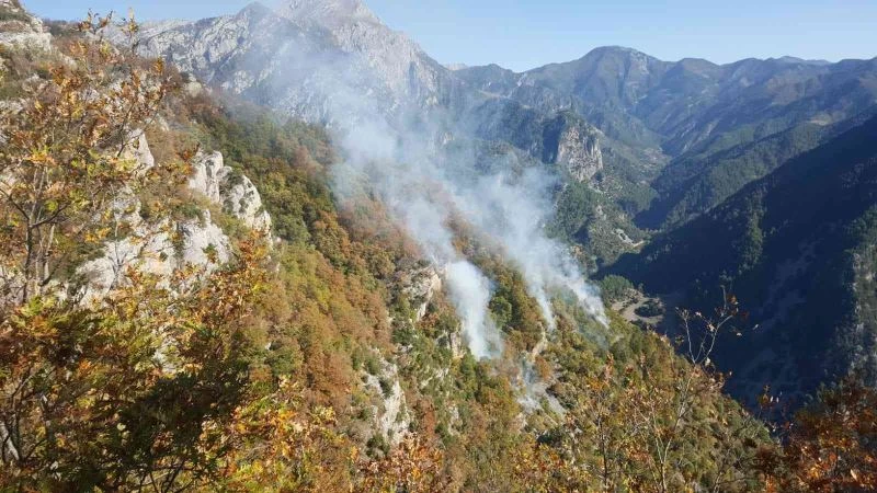 Bugün ise aynı noktada yeniden yangın çıktı. Arazinin sarp olmasından dolayı karadan müdahale edilemezken havadan 2 helikopter ile müdahale sürüyor.