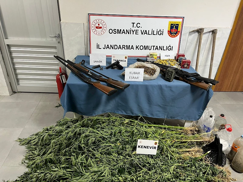 Tarla ve bahçede yapılan aramada, 1 kilo 80 gram esrar, 1 ruhsatsız tabanca, 3 av tüfeği ile silahlara ait mermi ve fişekler ele geçirildi.