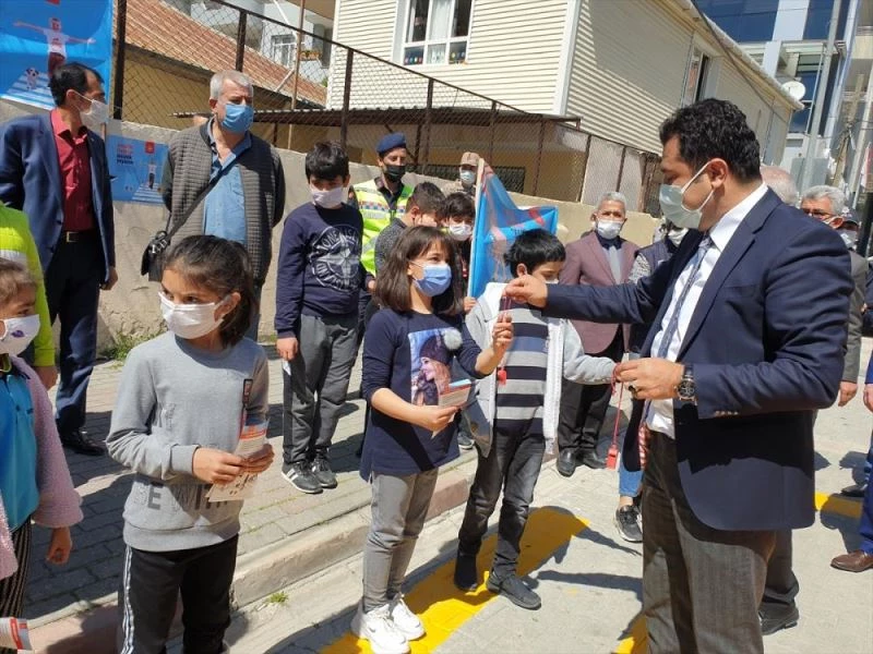 Kaymakam Ahmet Arık, Cumhuriyet İlkokulu önündeki Turgut Özal Caddesi'nde yaya yolunda hazırlanan bölümü fırçayla kırmızıya boyadı, öğrencilere kırmızı düdük hediye etti.