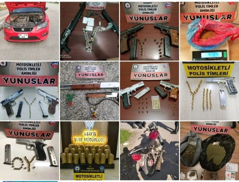 Osmaniye’de motosikletli polis timleri tarafından gerçekleştirilen uygulama ve operasyonlar kapsamında çok sayıda silah ve uyuşturucu madde ele geçirildi.