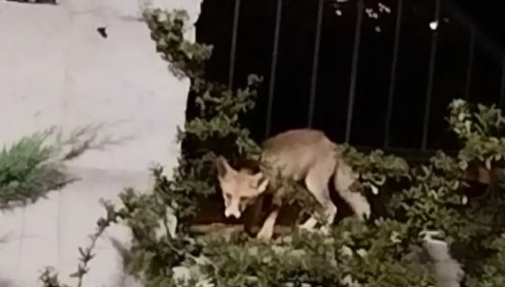 Vatandaşların dikkatini çeken tilki, cep telefonu kamerasıyla kaydedildi. Görüntülerde, tilkinin hastane duvarı üzerinde temkinli adımlarla ilerlediği ve yiyecek aradığı anlar yer aldı.
