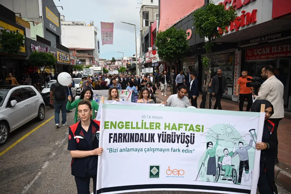 Osmaniye’de, 10-16 Mayıs Engelliler Haftası etkinlikleri kapsamında farkındalık yürüyüşü gerçekleştirildi. Osmaniye Belediyesi öncülüğünde, diğer kurum ve kuruluşlar, Engelli STK temsilcileri ile vatandaşların katılımıyla düzenlenen farkındalık yürüyüşü Atatürk Caddesi eski belediye önünden başlayıp, Cumhuriyet Meydanında son buldu. Yürüyüşe, Belediye Başkanı İbrahim Çenet, OKÜ Rektörü Prof. Dr. Turgay Uzun, MHP İl Başkanı Yusuf Çomu, Merkez İlçe Başkanı Bilal Çenet, belediye başkan yardımcıları ve meclis üyeleri, Ak Parti ve MHP kadın kolları temsilcileri, muhtarlar, Engelli STK temsilcileri ile vatandaşlar katıldı. Katılımcılar, yürüyüş sırasında “En büyük engel sevgisizliktir”, “Engelli olmak engel değildir”, “Engelsiz bir dünya” ve “Hayaller engel tanımaz” yazılı döviz taşıdılar.