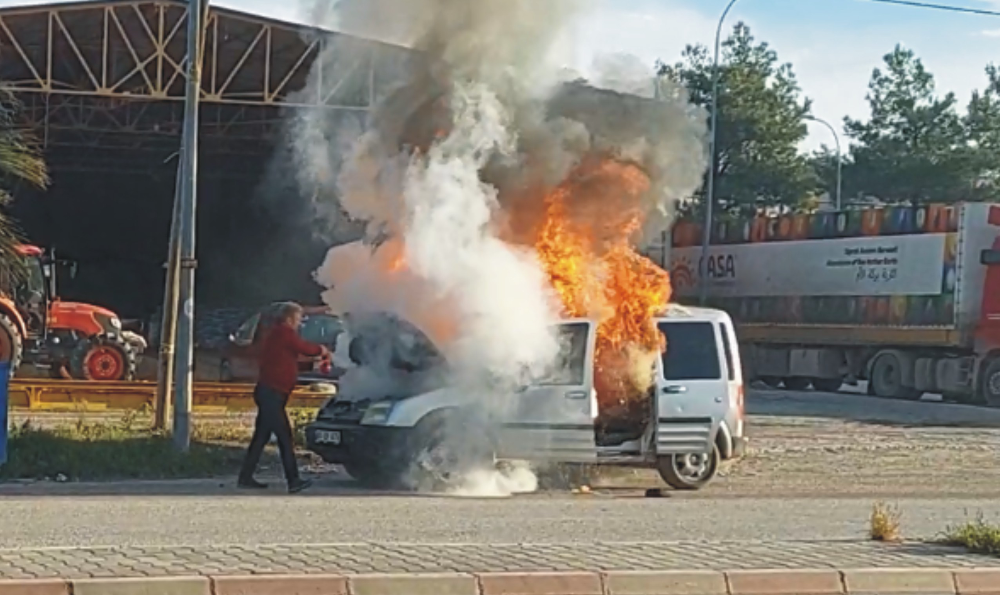 OSMANİYE’nin Toprakkale ilçesinde seyir halindeki hafif ticari araçta yangın çıktı. Alevlerin kısa sürede sardığı araçtaki yangın çevredeki vatandaşlar tarafından söndürüldü. İlçeye bağlı Atatürk Caddesi Osmaniye istikametinden Adana yönüne doğru ilerleyen hafif ticari aracın motor bölümünden dumanların yükseldiğini gören sürücü, aracını yol kenarına çekerek park etti. Alevlerin yükseldiğini gören diğer sürücüler ve vatandaşlar yangın tüpleriyle müdahale etmeye başladı. Yapılan ilk müdahale ile yangın daha fazla büyümeden söndürüldü. Daha sonra olay yerine gelen itfaiye ekipleri araçta soğutma çalışması başlattı. Yangını ilk görüp hemen iş yerindeki yangın tüpleri ile olay yerine koşan Esnaf Ali Mantar, “Yol kenarında bir araçtan dumanlar yükseldiğini gördük. Hararet yapmış zannettik. Daha sonra alevle yükselmeye başlayınca yangın tüpleri ile hızlıca olay yerine koştuk. Yangını büyümeden söndürdük” dedi. Araçta yangın nedeniyle büyük çapta maddi hasar oluşurken, soğutma çalışmasının tamamlanmasının ardından yol ulaşıma yeniden açıldı.