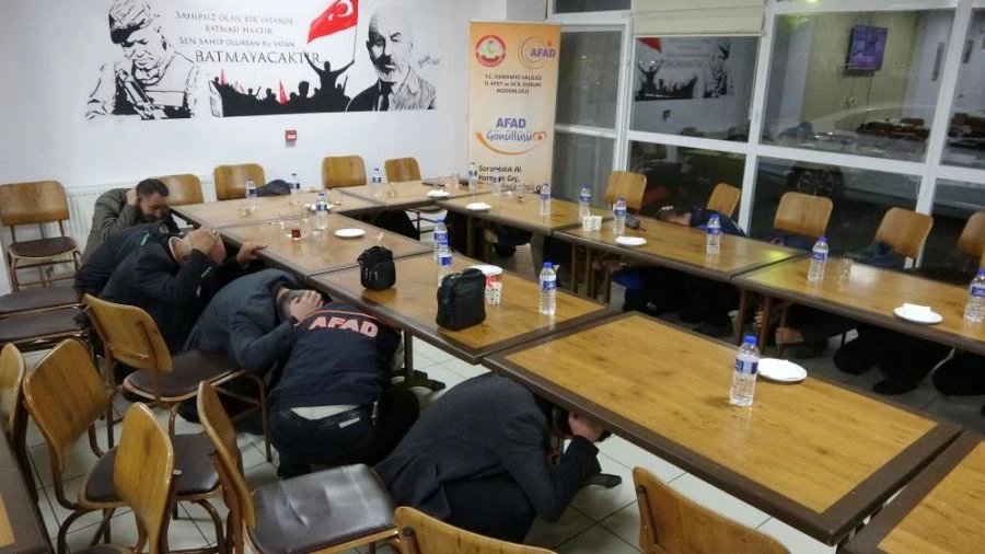 Osmaniye’de Karacaoğlan Erkek Yurdu’nda kalan öğrenciler deprem tatbikatına akşam yemeğinde yakaladı. Deprem sirenin çalmasının ardından “Çök-Kapan-Tutun” taktiğiyle öğrenciler kendilerini masaların altında korumaya aldı.