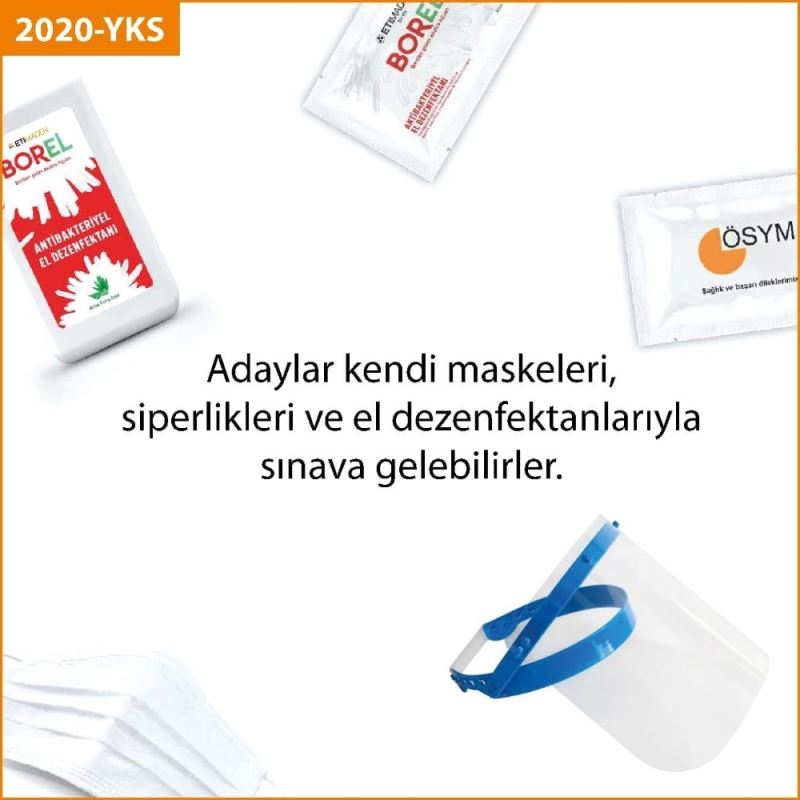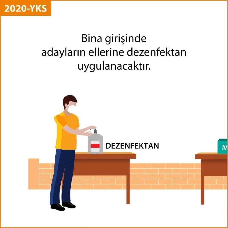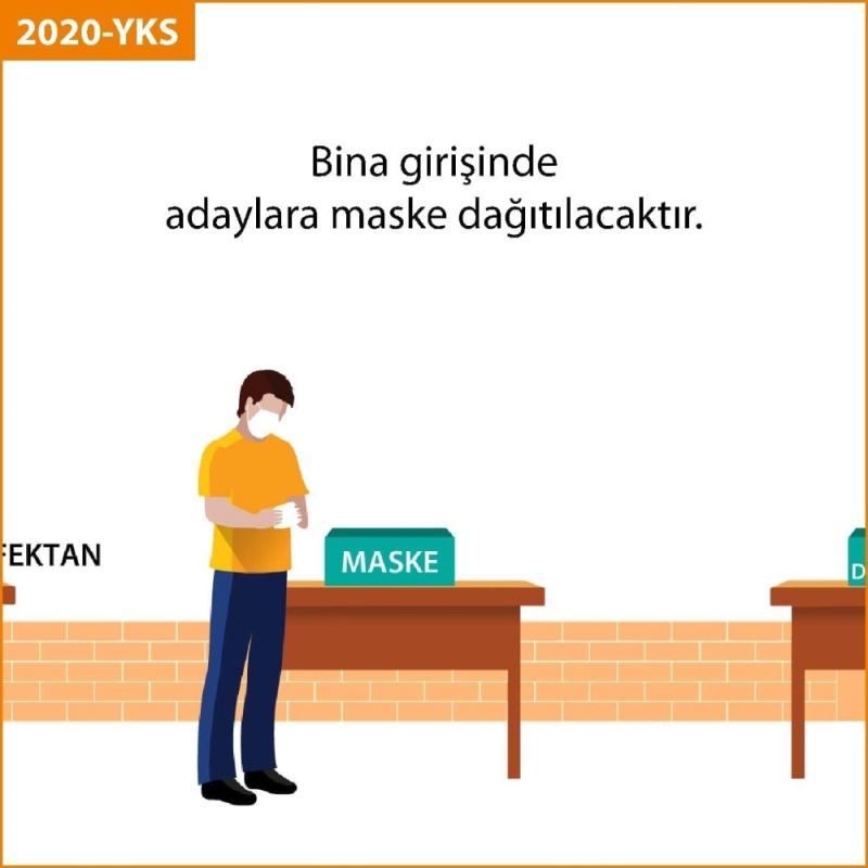 “Sınav binasına girişte, bina içerisinde ve sınav binasından çıkışta adayların sosyal mesafeyi korumaları için görevliler tarafından yönlendirme yapılacak. Bina girişinde adayların ellerine dezenfektan uygulanacak. Bina girişinde adaylara maske dağıtılacak. Bina girişinde adaylara el dezenfektanı dağıtılacak. Adaylar kendi maskeleri, siperlikleri ve el dezenfektanlarıyla sınava girebilecek.”