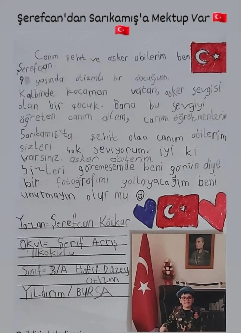 “Canım şehit ve asker abilerim; ben 9 yaşında otizmli bir çocuğum. Kalbinde kocaman vatan, asker sevgisi olan bir çocuk. Bana bu sevgiyi öğreten canım ailem, canım öğretmenlerim Sarıkamış’ta şehit olan canım ağabeylerim sizleri çok seviyorum. İyi ki varsınız asker ağabeylerim. Sizleri göremesem de beni görün diye bir fotoğrafımı yollayacağım. Beni unutmayın olur mu?”