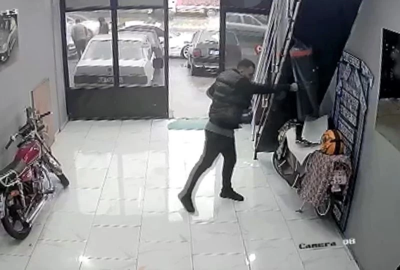 Galerici Uğur Gönül, hızını alamayarak boks torbasına yaklaşık 15-16 yumruk salladı. Darbelere dayanamayan boks torbası bir anda patlarken, parçaları ise etrafa saçıldı. Bu anlar ise iş yerinin güvenlik kamerasınca saniye saniye kaydedildi.
