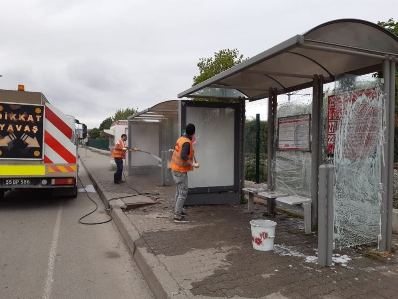 Samsun Büyükşehir Belediyesi’ne bağlı ekipler, sokağa çıkma kısıtlaması olduğu günlerde tüm otobüs duraklarını bakım ve onarımdan geçirerek, dezenfekte etti.