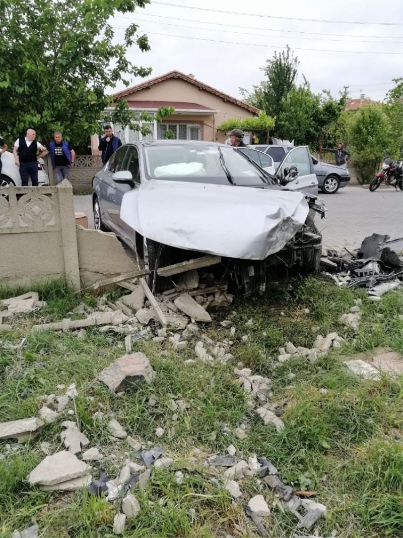 Tekirdağ’da kontrolden çıkan bir otomobil, bir evin bahçe duvarına çarptı.