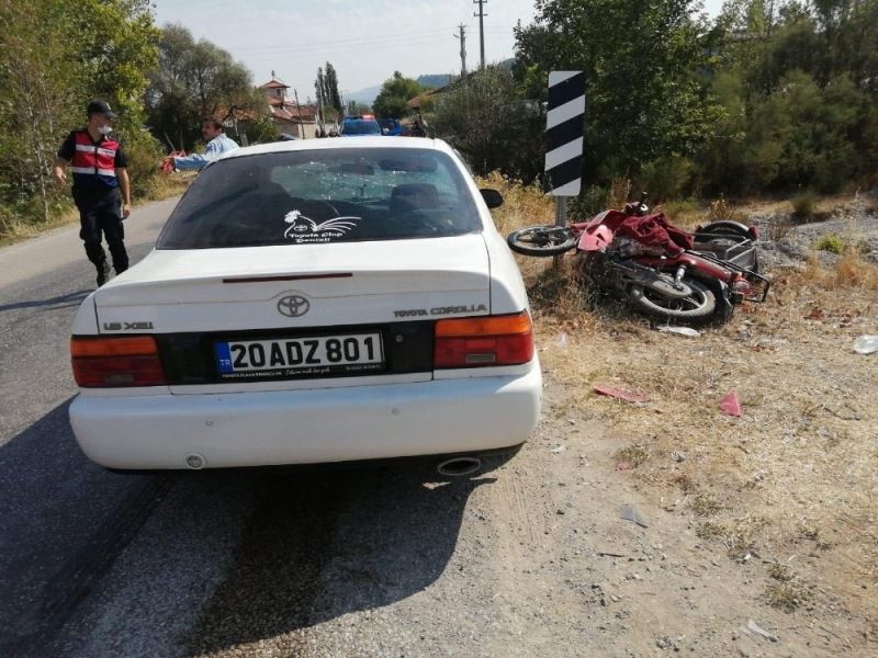 Denizli’nin Acıpayam ilçesinde otomobil ile motosiklet çarpıştı. Çarpışmanın etkisiyle savrulan motosiklet sürücüsü kadın, otomobilin ön camına çarparak ağır yaralandı. Hastaneye kaldırılan kadın sürücü yapılan müdahalelere rağmen hayatını kaybetti.