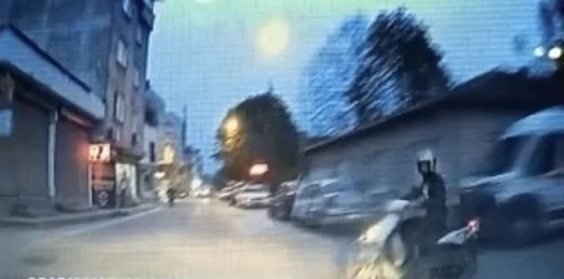O esnada cadde üzerinde seyir halindeki otomobil karşısına aniden çıkan motora çarparak durabildi. Yürekleri ağza getiren kazada şans eseri ciddi yaralanma meydana gelmezken, sürücünün savrulduğu anlar güvenlik kamerasına saniye saniye yansıdı.