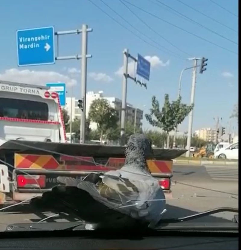 Şanlıurfa’nın Siverek ilçesinde bir otomobilin sileceklerinde seyahat eden güvercin, görenleri güldürttü.